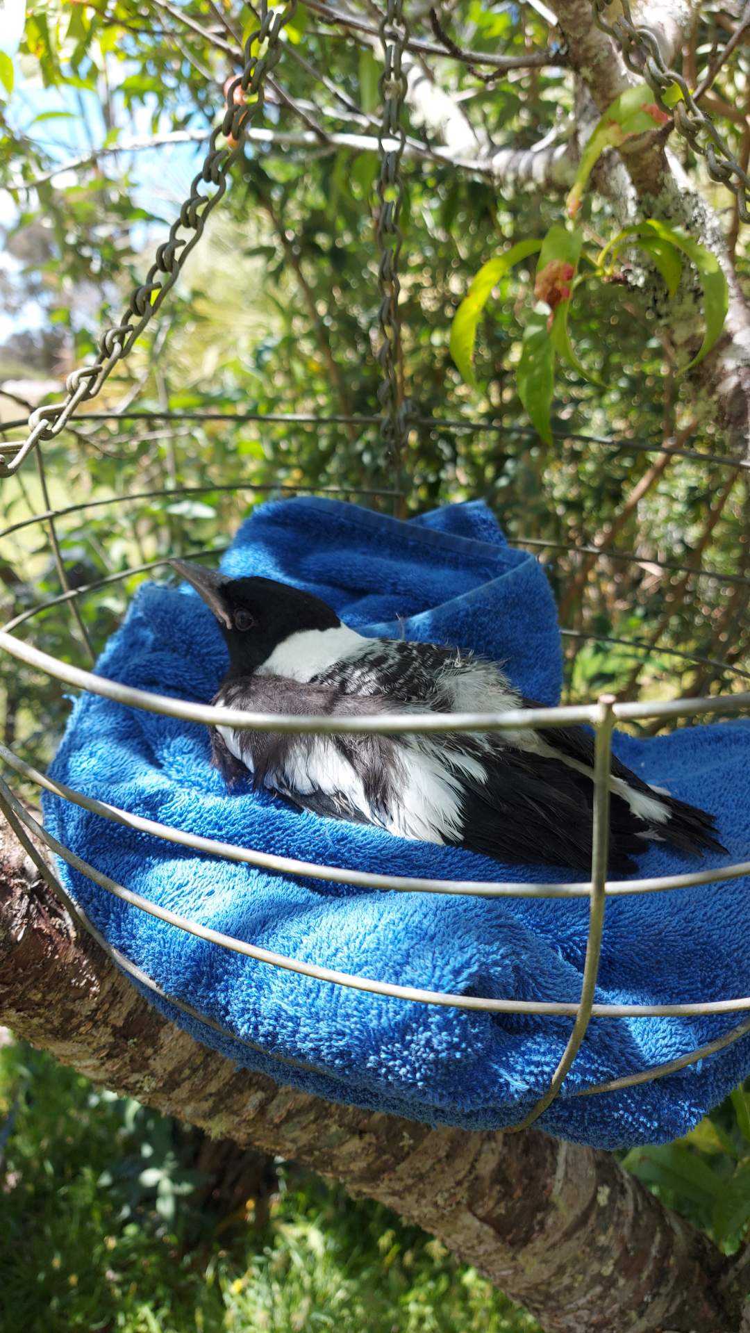Our first rescue at TGOE. A fledgling magpie floundering on the ground. We made a nest out of a hanging basket and a towel. Mum and dad are returning to feed and swoop anyone, or dog, that comes too close.